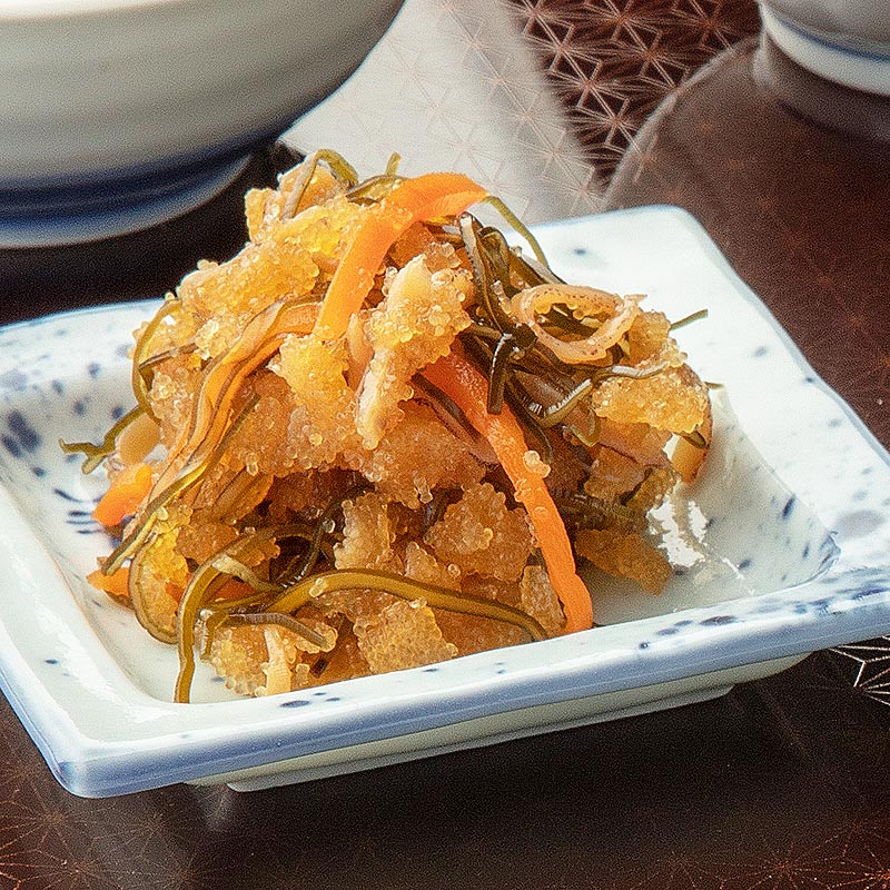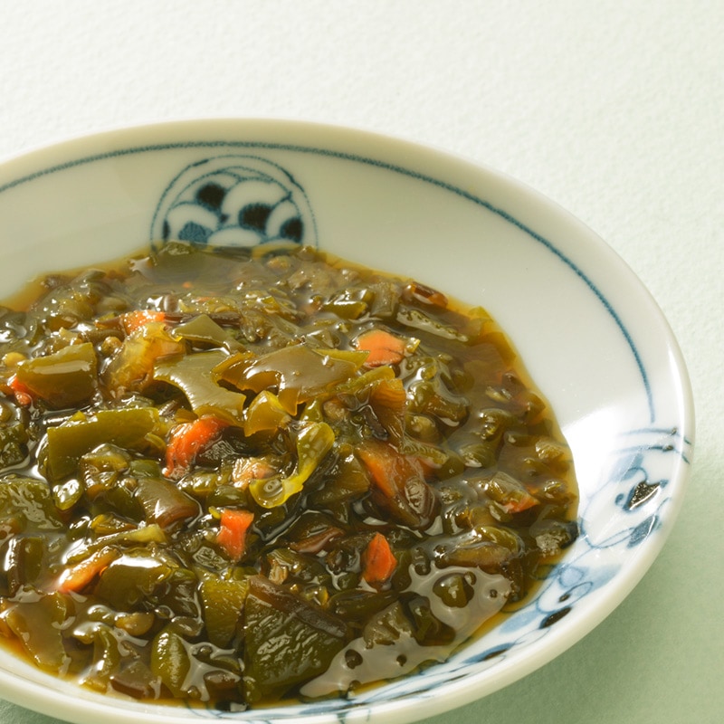 甘辛い佃煮、プチプチ食感の数の子松前漬、青唐辛子の風味が効いためかぶなんばんと、味わいも食感も異なる3品を揃えています。